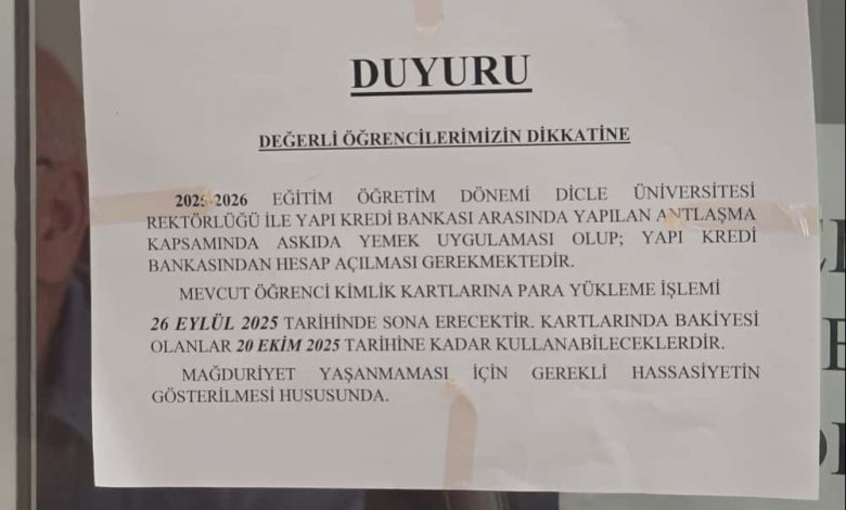 Evrensel’den Nurgül Deniz’in haberine göre, 2025-2026 eğitim-öğretim yılıyla birlikte Dicle Üniversitesinde öğrencilerin yemeğine zam geldi. Zamla birlikte bir öğün yemek ücreti 9 TL’den 30 TL’ye yükseltildi. Diğer yandan üniversite yönetiminin Yapı Kredi Bankası ile yaptığı protokolle artık yemekhaneden yararlanmak isteyen öğrenciler banka kartı kullanmak zorunda. Yemekhanede, öğrenci kartlarıyla yemek alınmasına son verildi. 20 Ekim 2025’ten sonra banka kartı olmayanların yemekhaneden yararlanamayacağı duyuruldu.
