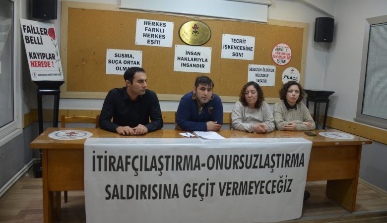 Açıklamanın yapıldığı salonda, “İtirafçılaştırma-onursuzlaştırma saldırısına geçit vermeyeceğiz” pankartı asıldı.