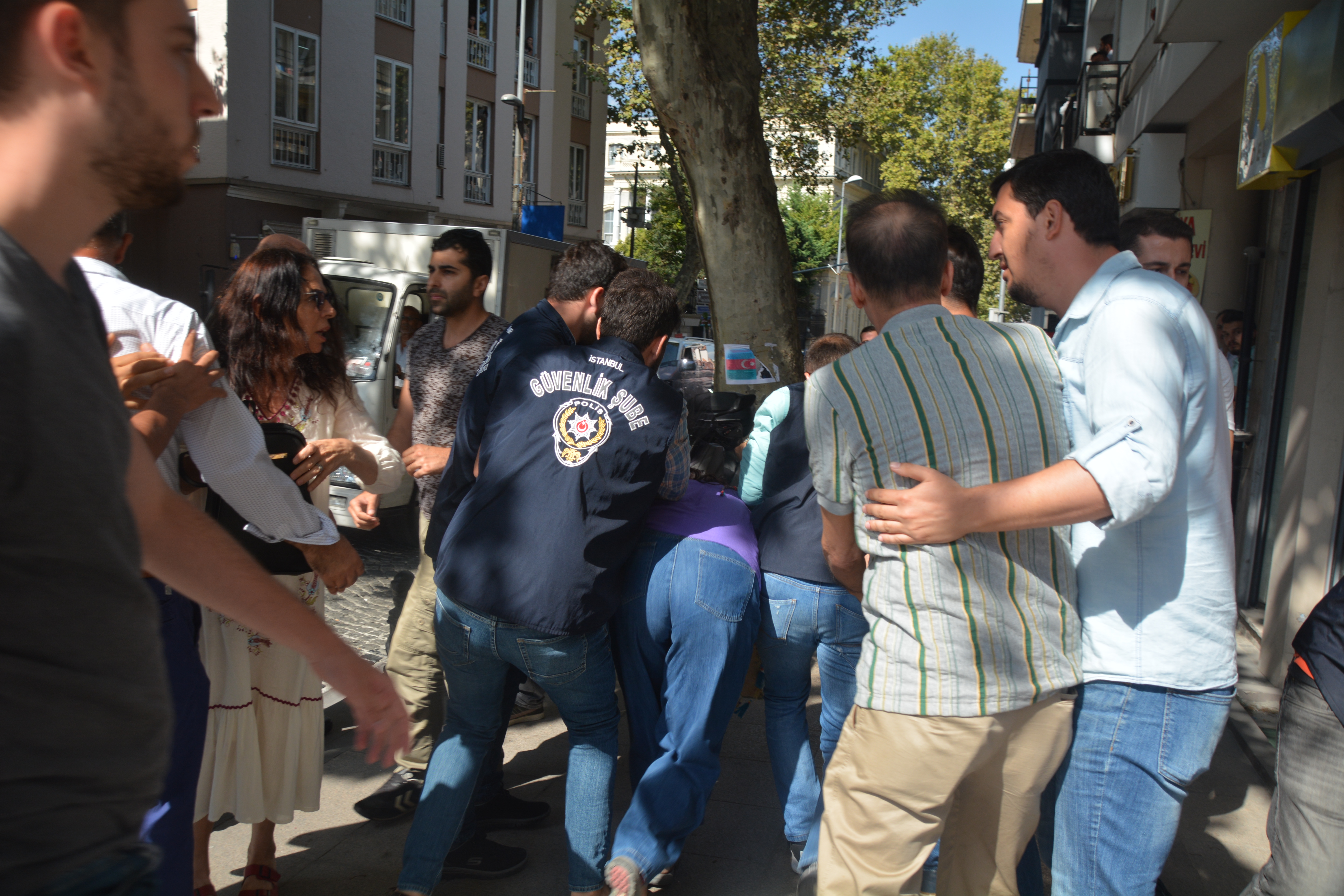 Konsolosluk önündeki eylem daha başlamadan, polis saldırısıyla Muazzez Avcı, Ercan Bilgili, Selçuk Avcı ile Mine Kaynak 4 kişi “Rahim Hüseyin yalnız değildir” sloganlarıyla gözaltına alındı.