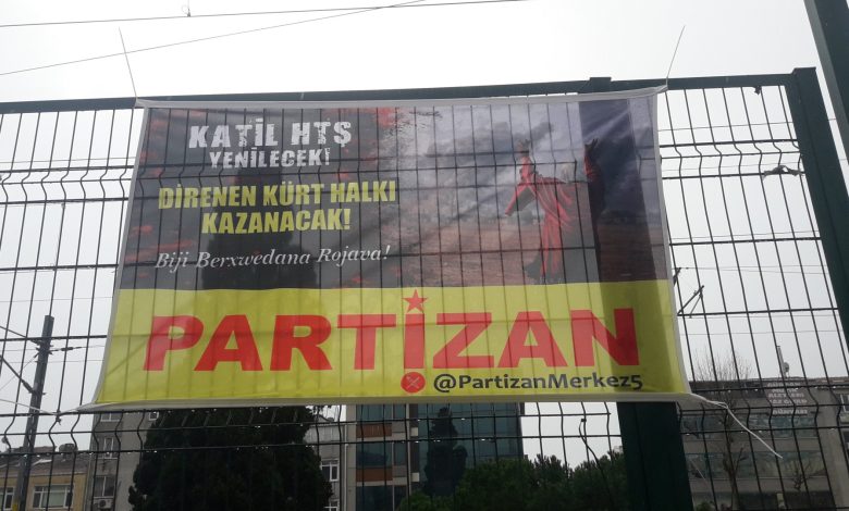 Partizan İstanbulun Kartal ilçesinde üzerinde Katil HTŞ Yenilecek Direnen Kürt halkı kazanacak! Bijî berxwedana Rojava!” yazılı pankartlar astı.