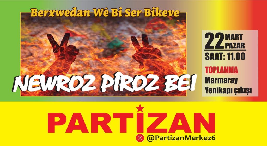 Partizan, 22 Mart’ta İstanbul, İzmir ve Ankara’da düzenlenecek Newroz etkinlikleri için sosyal medya hesaplarından çağrı yaptı. Yapılan paylaşımlarda, Newroz’un özgürlük, direniş ve umut günü olduğu vurgulandı.