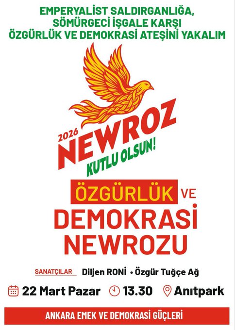 Ankara’daki çağrıda ise Emek ve Demokrasi Güçleri bileşeni olarak, “Emperyalist saldırganlığa, sömürgeci işgale karşı özgürlük ve demokrasi ateşini yakalım” şiarıyla halk alanlara davet edildi. Newroz 22 Mart Pazar günü saat 13.30’da Anıtpark’ta gerçekleşecek.