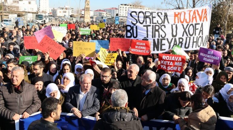 Açıklamanın devamında, “Kürt ulusu yüzyıldır ezildi, katledildi. Ulusal hakları hiç bir zaman tanınmadı. 6 Ocak 2026 gününden bu yana Kürt ulusu yeni bir katliamla karşı karşıyadır. Kürtlerin en yoğun yaşadığı Kobani, Heseke ve Kamışlı abluka altında. Halkın en temel ihtiyacı olan gıda, su ve elektrikler kesilmiş ve teslim olmaya zorlanmaktadır. Emperyalistler ve İsrail devleti, tıpkı Gazze’de yaptıklarını 6 Ocak’tan bu yana Rojava’da yapıyorlar. Rojava insansızlandırılarak, Kürt topraklarına HTŞ çeteleri yerleştirilmek isteniyor.