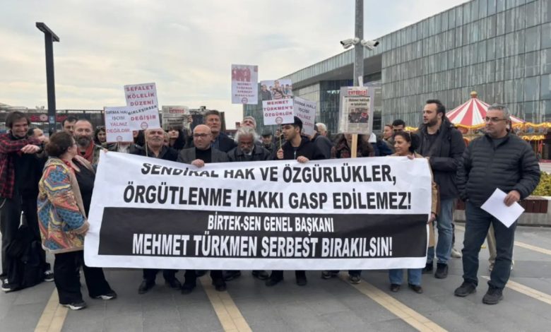 Eyleme katılanlar, sendika haklarının ve işçilerin temel haklarının korunması çağrısında bulunarak, Türkmen’in serbest bırakılmasını talep etti.