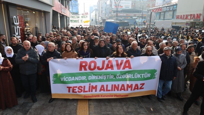 Demokratik Bölgeler Partisi (DBP) il binası önünde toplayan yüzlerce kişi buradan, “Rojava, vicdandır, direniştir, özgürlüktür, teslim alınamaz” pankartı ile yürüyüşe geçti. Yürüyüşte sıklıkla, “Katil HTŞ”, “Bijî berxwedana Rojava”, “Bijî yêkitiye gelê kurd” sloganları atıldı. Sık sık polis engeli ile karşılaşan kitle zılgıt ve sloganlarla polis engelini aştı.