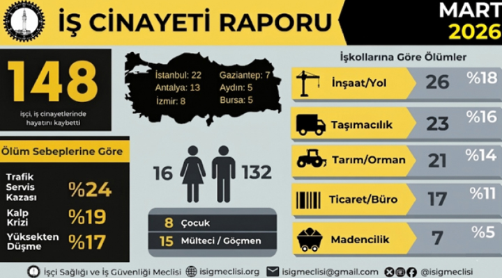 İSİG Meclisi’nin Mart 2026 raporuna göre, mart ayında en az 148 işçi iş cinayetlerinde yaşamını yitirdi. Böylece 2026’nın ilk üç ayında iş cinayetlerinde hayatını kaybeden işçi sayısı 432’ye ulaştı. Ocak ayında 155, şubat ayında ise 129 işçi ölmüştü.