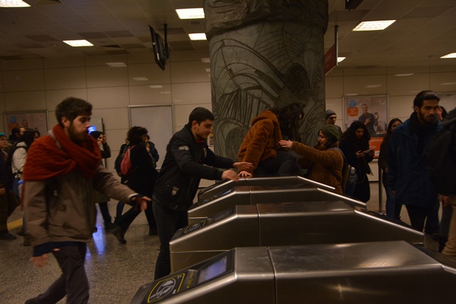 Üniversite durağındaki metro turnikelerinden atlayan öğrenciler metroya kadar; ‘Yemek kriz, yol kriz, ezilen hep bizleriz’, ‘Akbil basma, tunikeden atla’ sloganları atıldı.