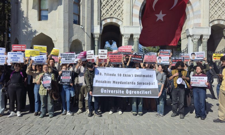 İSTANBUL – 10 Ekim Ankara Gar Katliamı’nın 10. yılında üniversite öğrencileri, İstanbul Üniversitesi Beyazıt Ana Kapı önünde bir araya geldi. “10 Ekim’i unutmayacağız, hesabını meydanlarda soracağız” yazılı pankart açan öğrenciler, katliamda yaşamını yitirenleri andı ve adalet talebini yineledi.