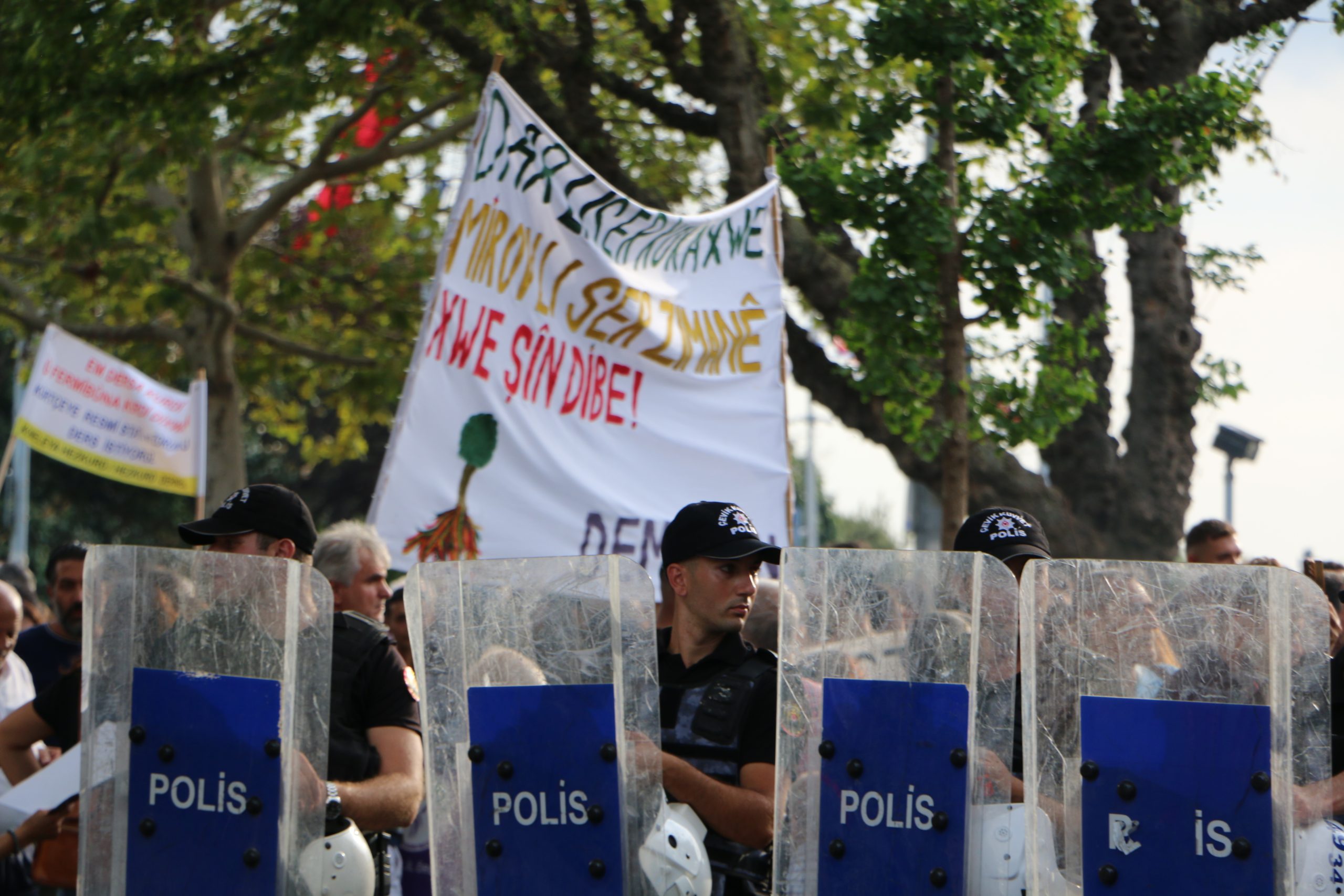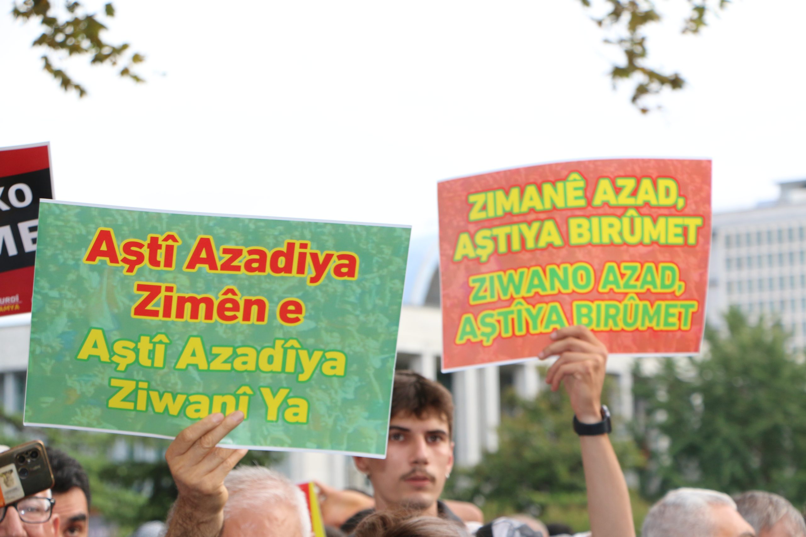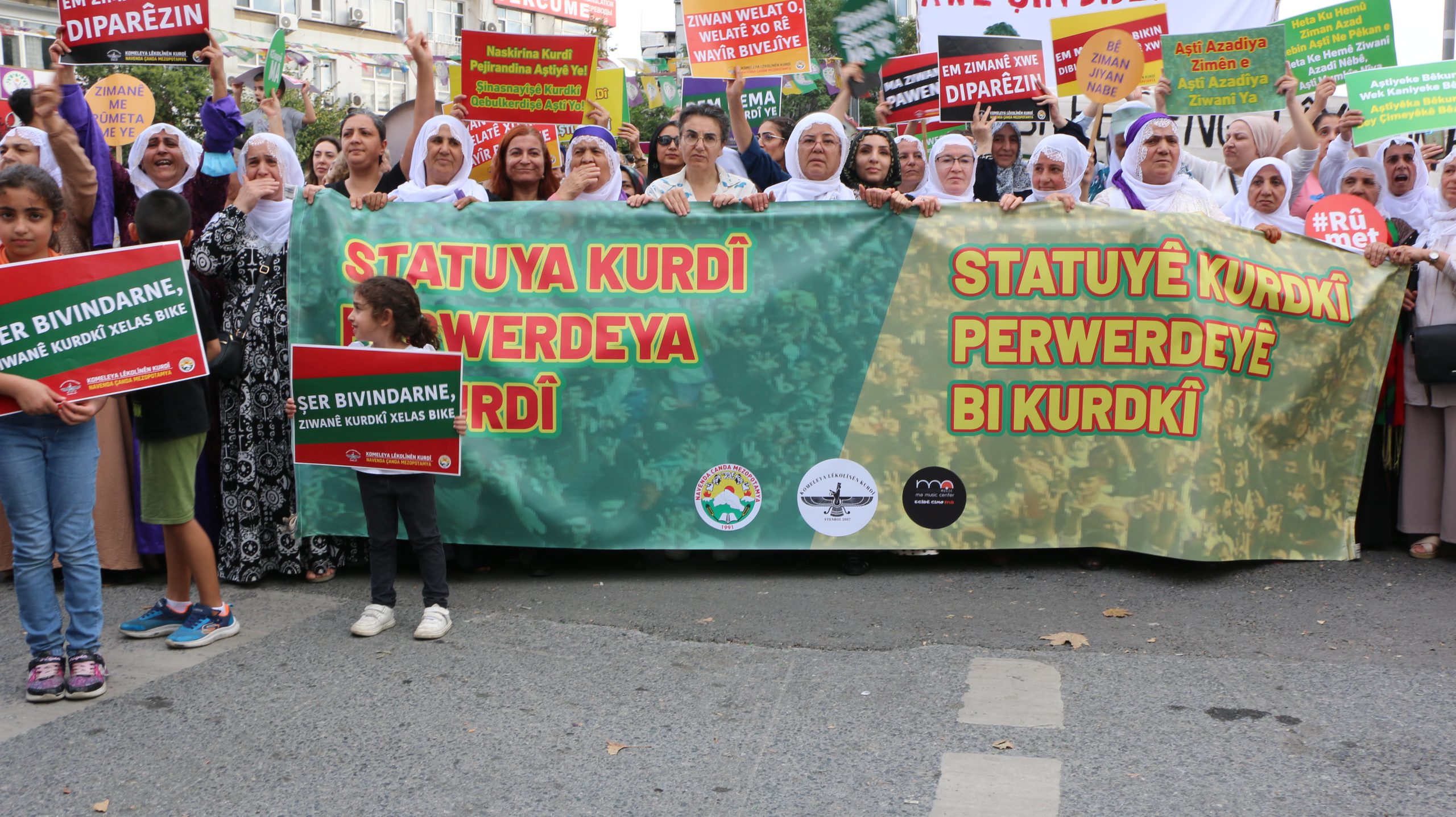 Yenikapı’daki DEM Parti ilçe örgütü önünde bir araya gelen halk “Statûya Kurdî, perwerdeya bi Kurdi” pankartı arkasında Saraçhane’ye yürüdü. Yürüyüş boyunca “Bê ziman jiyan nabe”, “Anadilde eğitim hakkımızdır”, “Bê Serok jîyan nabe”, “Zimanê Kurdî rûmetameye” sloganları atıldı; “Aştî azadiya zimên e”, “Naskirina Kurdî pejirandina aştiyê ye”, “Em mala xwe bikin dibistana zimanê xwê” dövizleri taşındı.