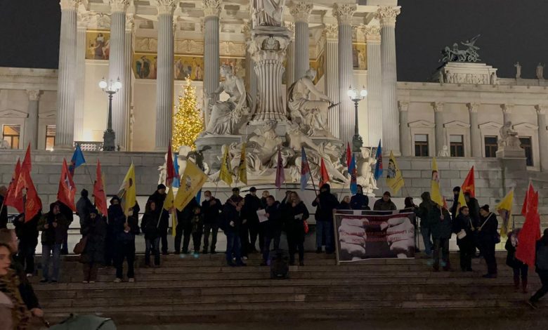 19 Aralık 2025’te Viyana’da parlamentosu önünde düzenlenen eylemde, 19 Aralık Hapishaneler Katliamı ile kuyu tipi hapishaneler protesto edildi; Türkiye hapishanelerindeki hak ihlallerine dikkat çekildi.