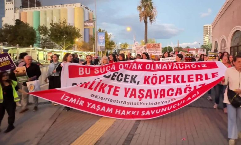 ‘4 Ekim Dünya Hayvanları Koruma Günü’ dolayısıyla İzmir’de yaşam hakkı savunucuları ve İzmir Barosu üyesi avukatlar, Alsancak Garı önünde toplanarak Kıbrıs Şehitleri Caddesi’ndeki Türkan Saylan Kültür Merkezi önüne yürüdü. Grup, burada bir basın açıklaması gerçekleştirdi.