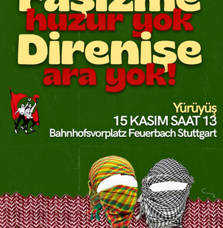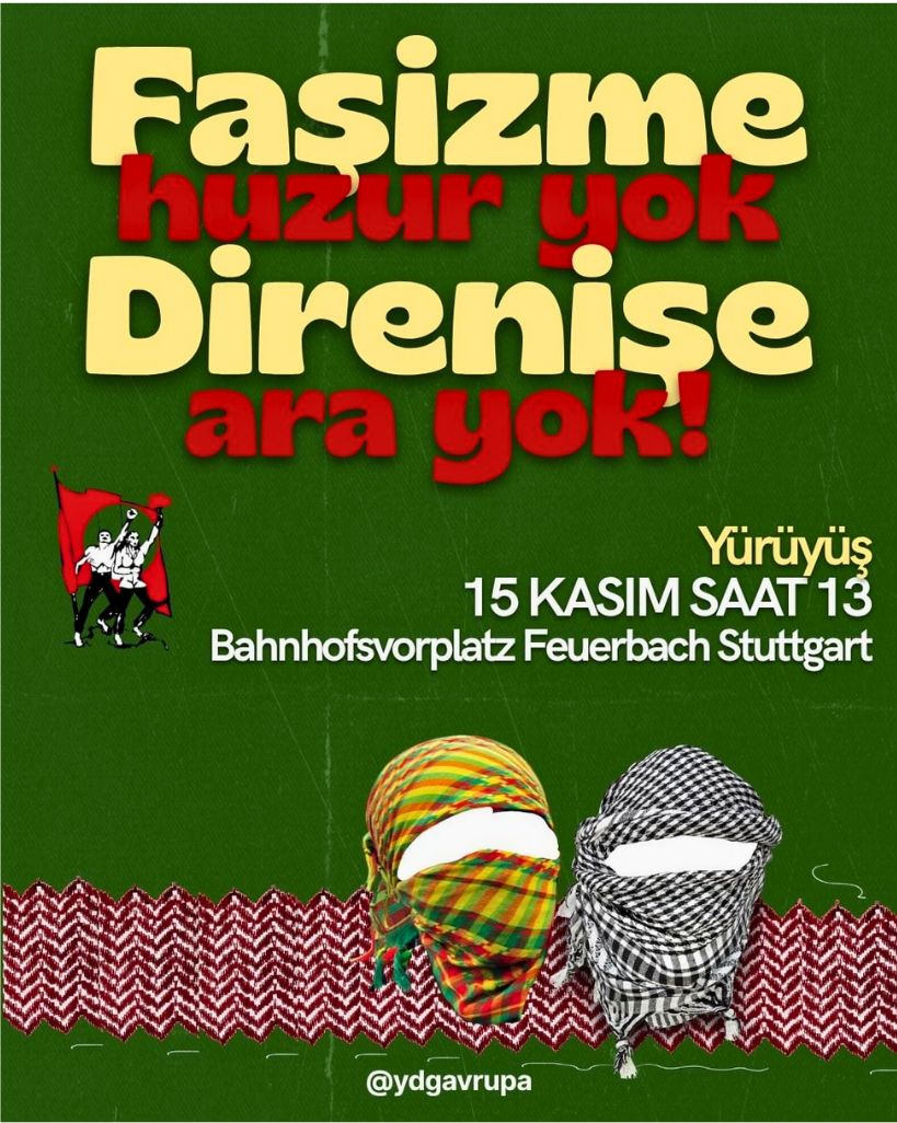 Stuttgart: YDG’nin tarafından yapılan açıklamada 15 Kasım Cumartesi günü saat 13.00’te Stuttgart Feuerbach Bahnhof’da yürüyüş, ardından saat 15.00’te 33. Gençlik, Kültür ve Sanat Festivali gerçekleştirilecek.