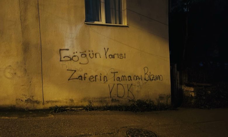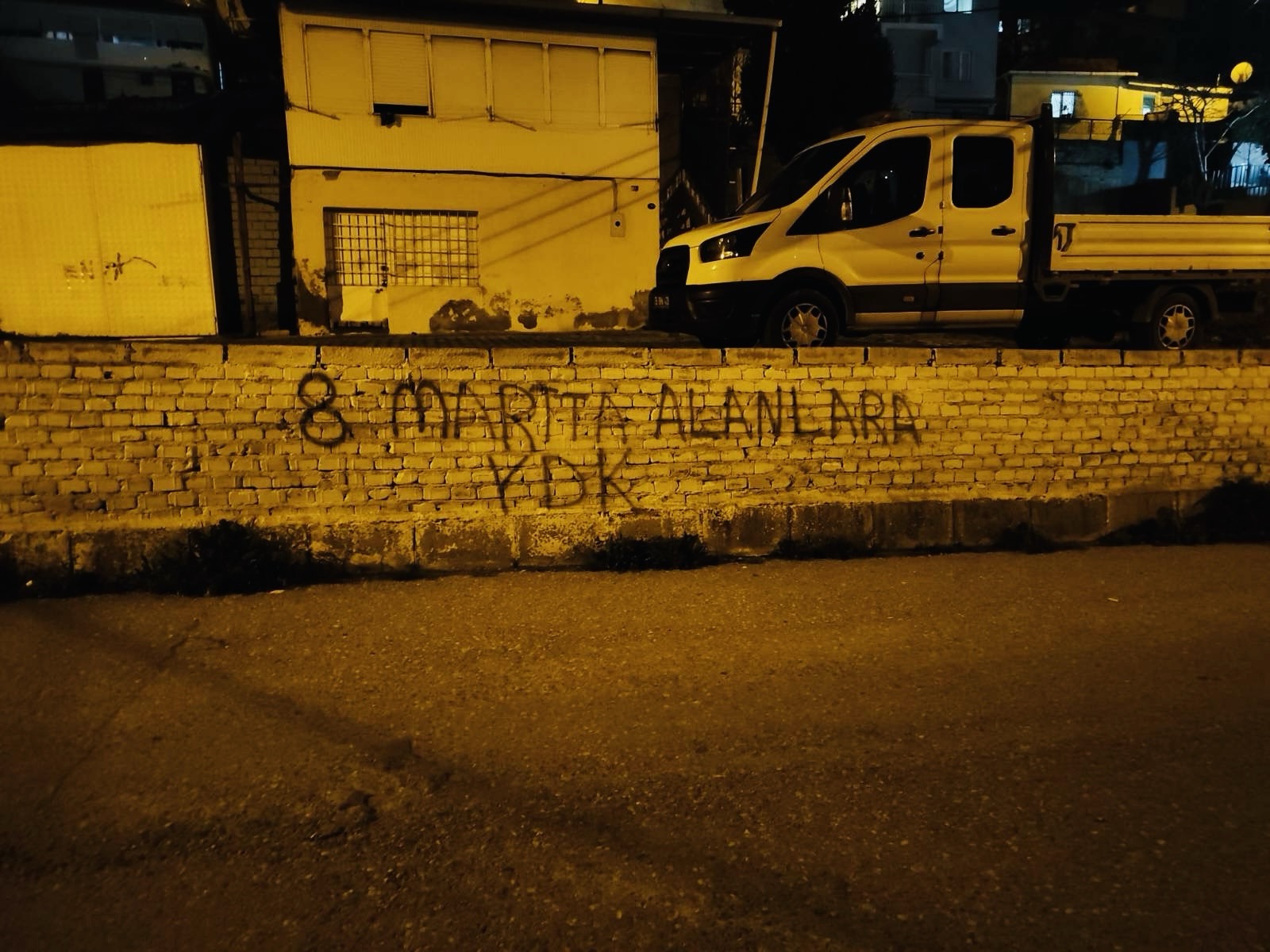 İzmir’de “8 Mart’ta alanlara” ve “Göğün yarısı, zaferin tamamı bizim” sloganlarının yer aldığı yazılamalar yapan YDK, sosyal medya hesabından şu mesajı paylaştı: